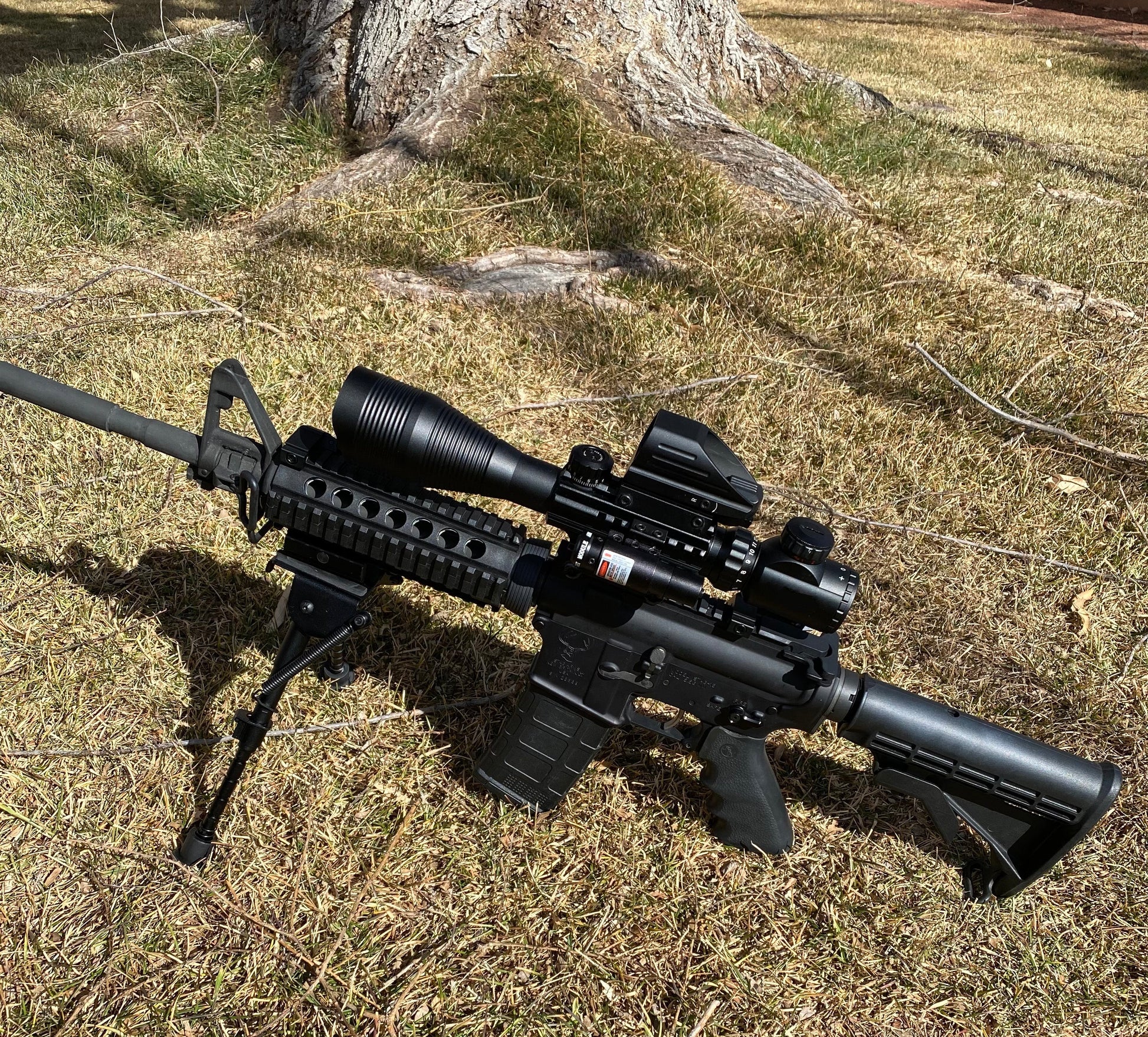 Powerful magnification makes this scope well suited for mid to long range and the dot sight, 45 degree flip up sights and laser provide quick acquisition of close quarter & fast moving targets.